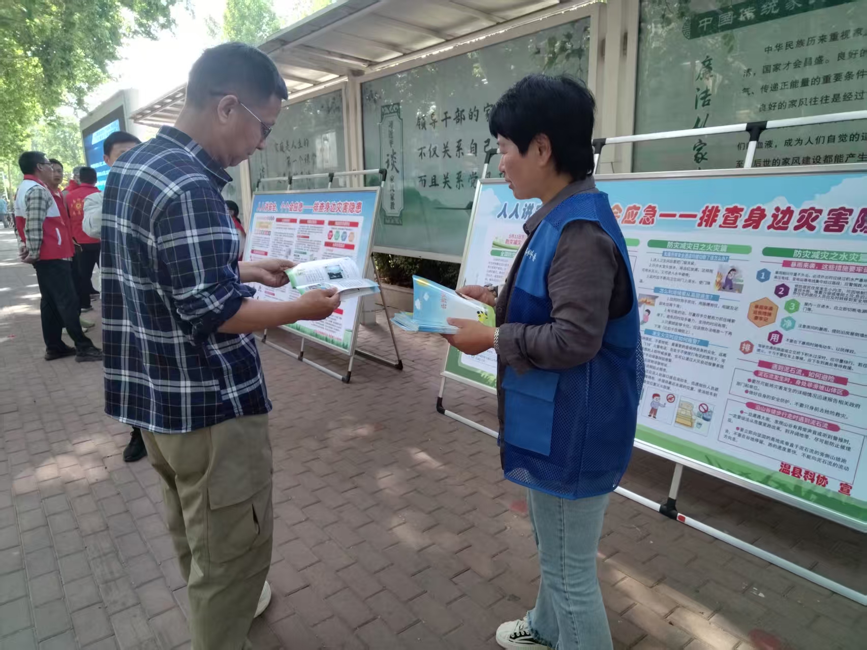 温县科协工作人员在现场通过展板、发放宣传资料等对群众进行科普防灾减灾知识。让群众在遇到自然灾害时能够安全避险,当地震发生时,首先要保持冷静,可迅速撤离到空旷地带。在洪水来临前,应关注天气预报和洪水预警信息,准备好救生衣、手电筒、哨子等应急物品。在台风来临前,要加固门窗,清理阳台上的杂物,避免被风吹落伤人。如果火灾发生在室内,要迅速用湿毛巾捂住口鼻、低姿前行,避免吸入有毒烟气。