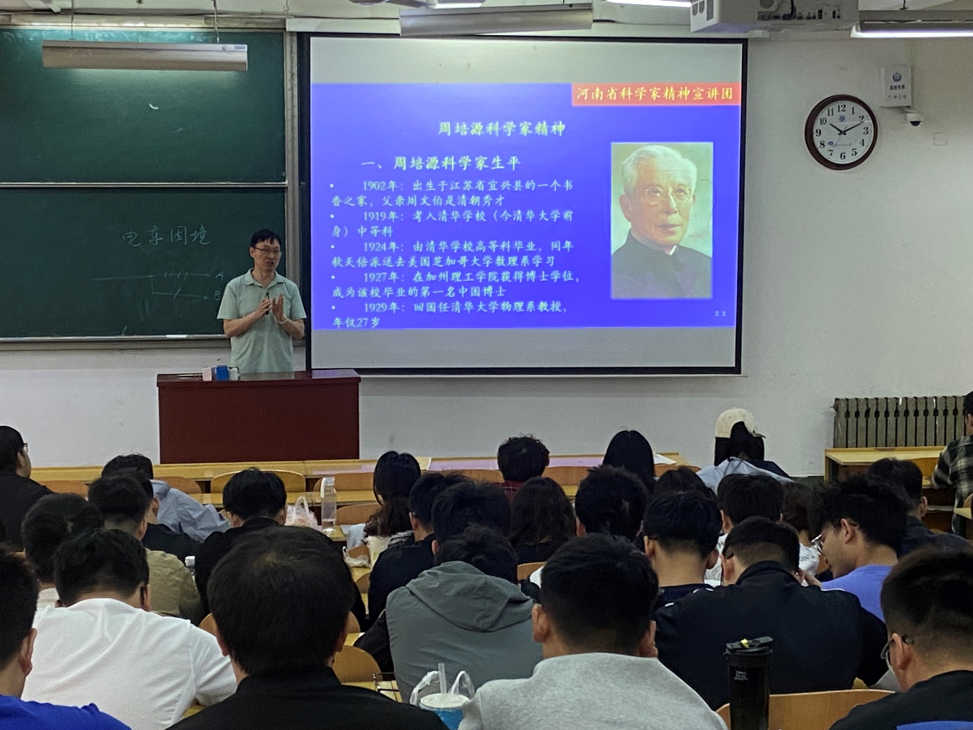 为弘扬科学家精神,缅怀我国著名理论物理学家、流体力学家、教育家,中国近代力学奠基人和理论物理奠基人之一周培源院士,5月25日,在全国科技工作者日来临之际,河南省科学家精神宣讲团成员、焦作市首席科普专家、河南理工大学副教授仝兆景博士在河南理工大学电气学院为2024级专业学位硕士研究生130人开展周培源院士科学家精神宣讲。