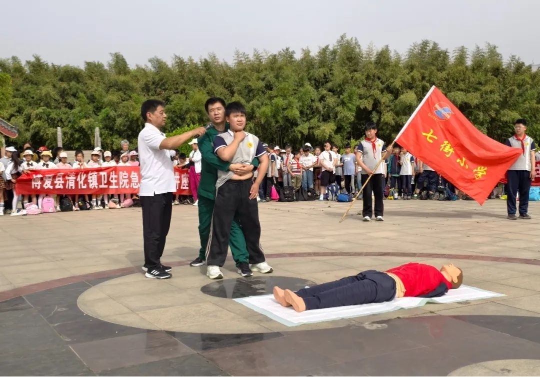 活动现场,清化镇卫生院急诊科副主任李战伟化身“科普讲师”,以通俗易懂的语言,系统讲解心肺复苏、海姆立克急救法等实用技能,他一边操作,一边强调每个动作的要点,如心肺复苏时胸外按压的位置、深度、频率,以及开放气道的正确方法;海姆立克急救法针对不同年龄段人群的操作差异等。为了让学生们更好地掌握这些技能,医护人员邀请学生上台进行实践操作,手把手指导他们调整姿势、规范动作。学生们积极参与,热情高涨,在反复练习中逐渐掌握了急救技能的要领。