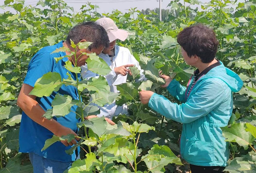 在杨木苗圃,苏雪辉一株一株翻看杨树叶背面,洁净干燥,顶梢的树脂油亮泛绿,生长良好。苏雪辉指出7月份高温高湿下可能发生的苗木病害,一定要加以重视,提前防范,进行化控。
