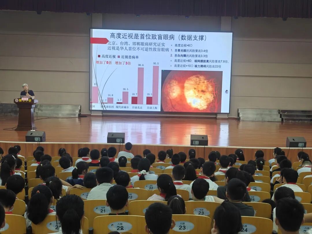 眼科权威专家徐亮教授则聚焦孩子们的日常健康痛点,以《用科学思维解读近视眼》为题,为师生们揭开近视防控的 “神秘面纱”。他首先通过清晰直观的眼球构造图,让孩子们轻松理解眼睛的工作原理;随后深入浅出地讲解近视形成的内在机制、影响视力的主要因素,并结合青少年常见的用眼场景,系统普及近视防控知识 —— 从“为什么越靠近屏幕越看不清”等常见疑问解答,到“高度近视可能引发的眼部疾病” 等健康危害科普,再到“每天 2 小时户外光照”“每用眼 20 分钟远眺 20 秒”等科学防控方法,以及“定期检测眼轴长度”等防控效果评估方式,每一个环节都紧密贴合孩子们的生活,实用性十足。徐教授还特别剖析了 “长时间低头看手机”“写字时脑袋偏向一侧”等不良用眼习惯,手把手指导师生掌握科学用眼的规范与注意事项,让“保护视力”真正从口号变成可落地的日常行动。