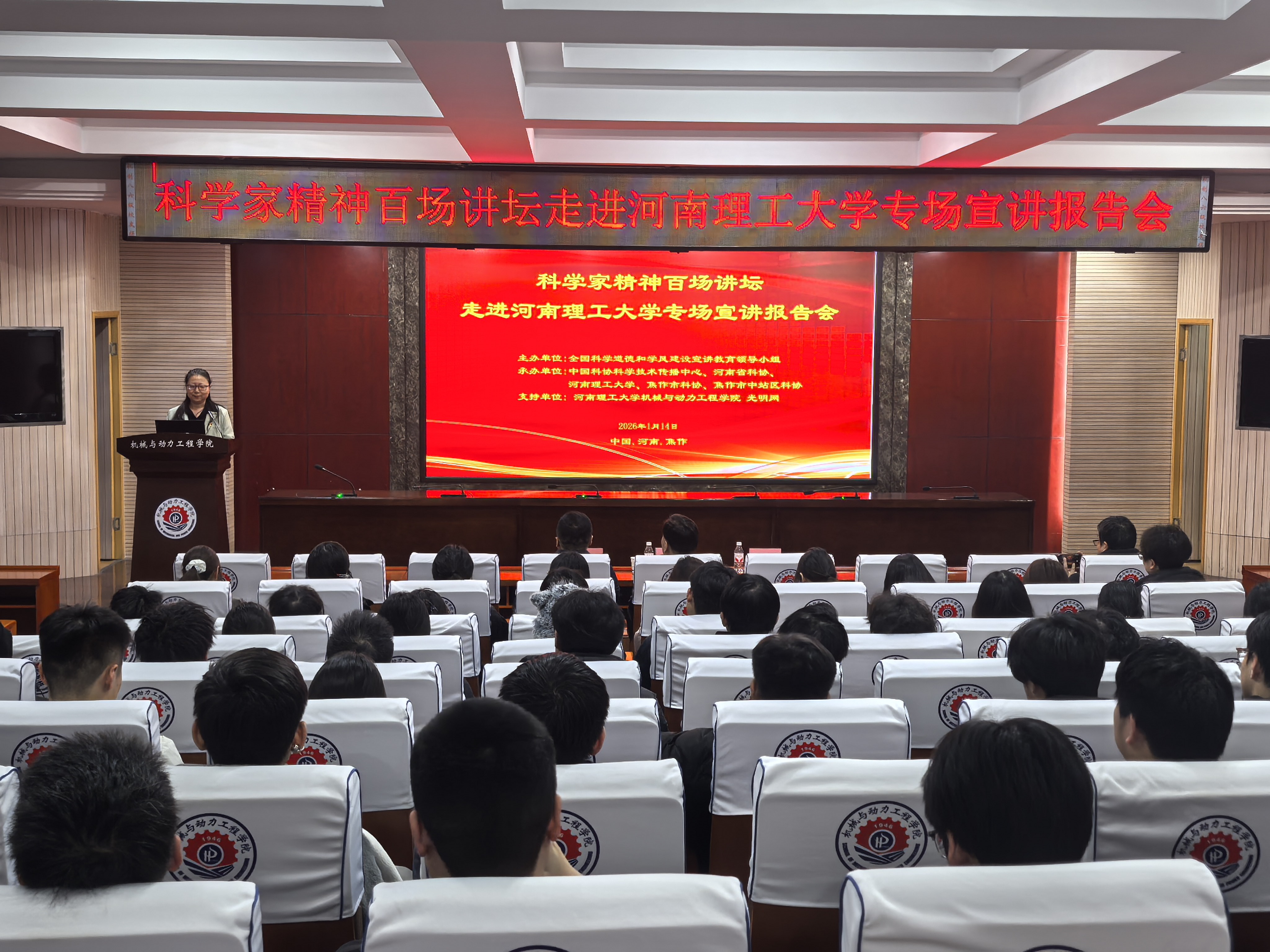 1月14日晚,由全国科学道德和学风建设宣讲教育领导小组主办,中国科协科学技术传播中心、河南省科协指导,市科协联合河南理工大学共同承办的“科学家精神百场讲坛”活动在理工大机械与动力工程学院报告厅成功举办。市科协党组书记王智民出席活动并致辞。