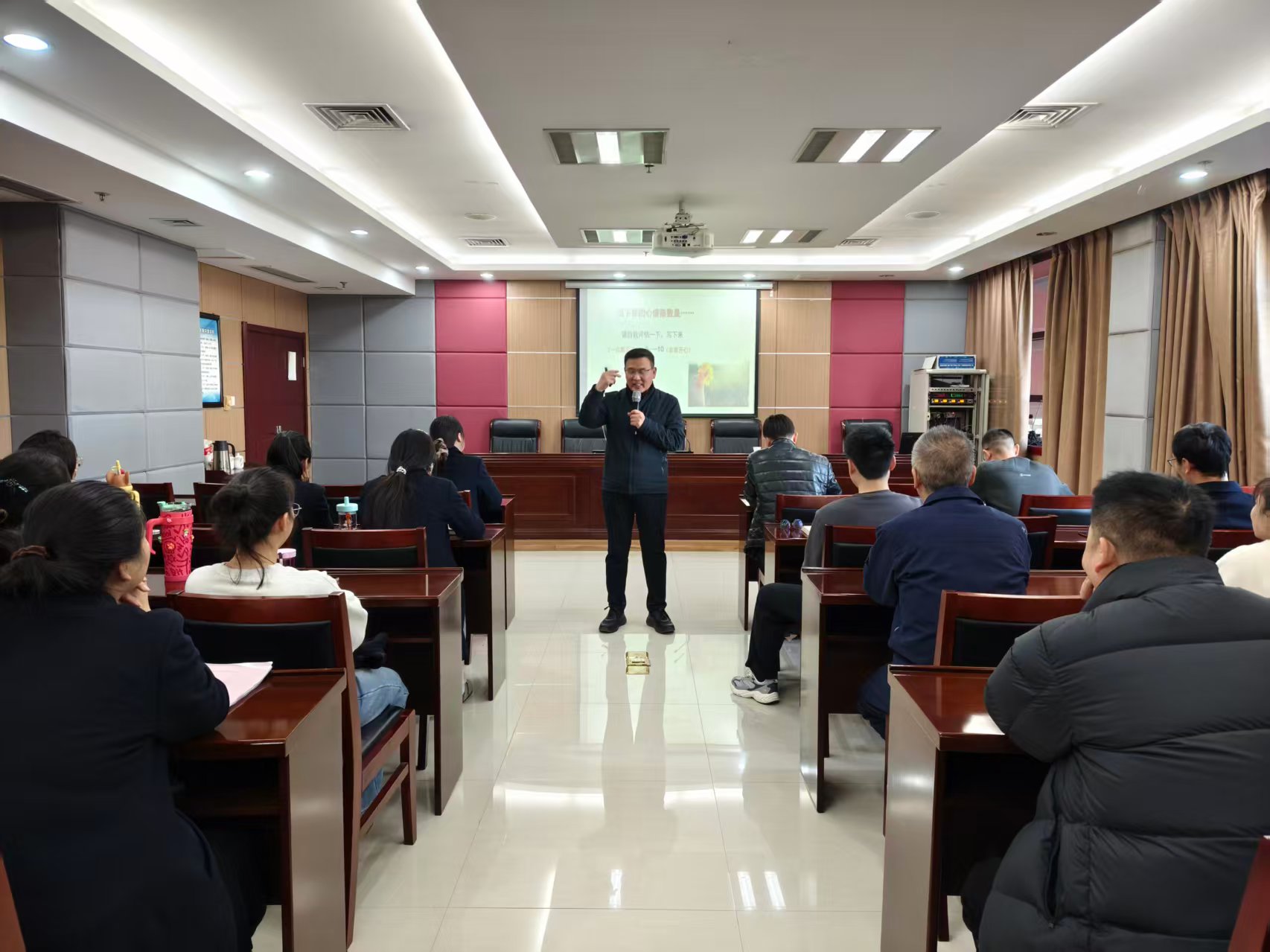 讲座中,温老师通过“当下心情指数评估”“美好事物聚焦”“自我觉察练习”等互动环节,引导与会者正视情绪状态,学会在日常工作与生活中主动积累积极体验。针对工作人员常见的情绪管理、压力等方面,温老师分享了“每日积极三问”“5-4-3-2-1着陆法”“幸福五施”等实用心理工具,鼓励大家通过“真心地笑、积极地动、开心地说、用心地看、投入地做”来提升心理调节能力。他指出“问题本身不是问题,如何看待问题才是关键”,倡导以积极视角重构工作与生活体验,在履职尽责的同时实现自我成长。