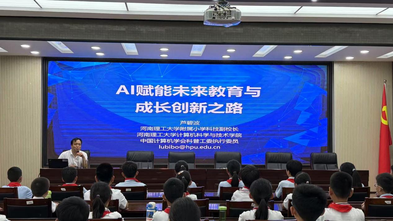 为积极响应《教育强国建设规划纲要(2024—2035年)》,推动教育数字化发展,5月7日下午,河南理工大学附属小学迎来了一堂别开生面的AI课程。河南理工大学计算机科学与技术学院教授、附属小学科技副校长芦碧波,以“AI赋能未来教育与成长创新之路”为主题,为五年级学生呈现了一场精彩的科技启蒙课。