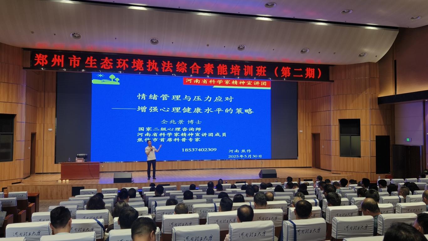 为提升干部职工心理健康水平,增强生态环境执法工作效能,5月30日,正值全国科技工作者日,河南省科学家精神宣讲团成员、国家二级心理咨询师、焦作市首席科普专家、河南理工大学副教授仝兆景在河南理工大学图书馆报告厅为郑州市生态环境执法局干部职工开展题为“情绪管理与压力应对-增强心理健康水平的策略”心理讲座。