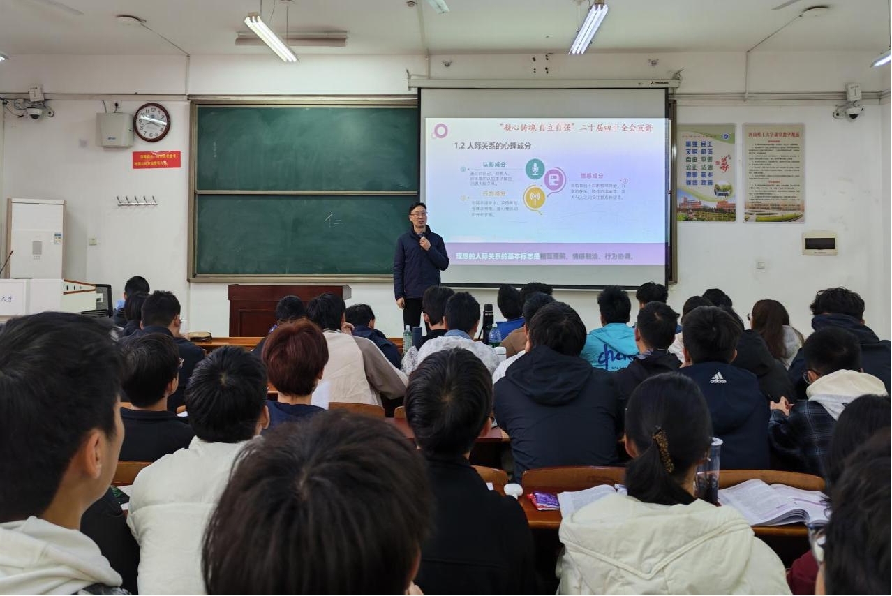 宣讲中,仝兆景以“提升人际关系”为切入点,打破理论宣讲与心理科普的壁垒。他结合专业知识与鲜活案例,阐释心理能量的核心内涵时明确:良好人际关系是激发心理能量的重要纽带,充沛心理能量既是个人成长的“内驱力”,更是落实全会精神的“软实力”。这一观点让在场大学生深刻认识到,个人心理建设与国家发展大局紧密相连。