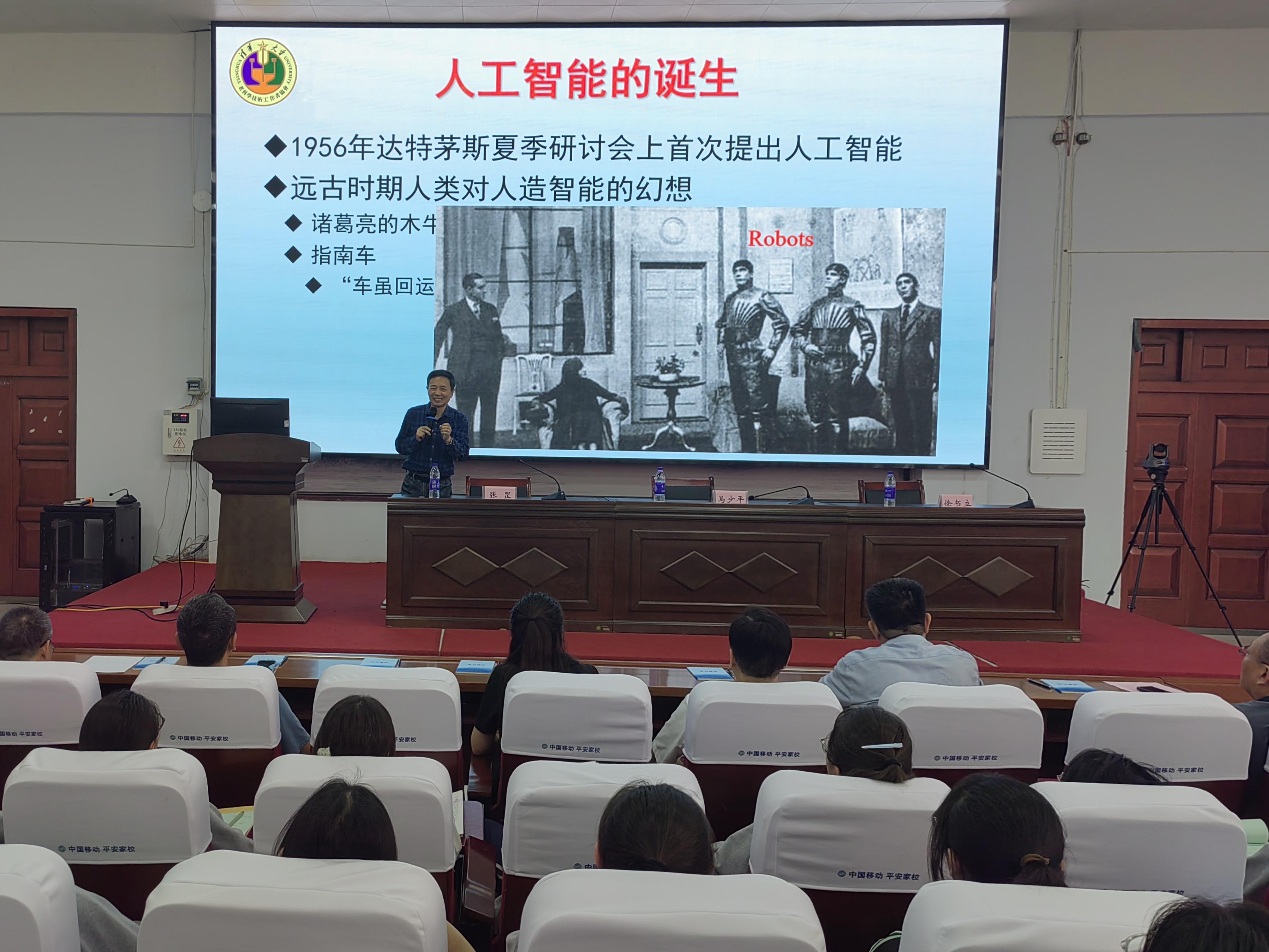 在博爱县第一中学,马少平教授作《走进人工智能世界》科普报告,从木牛流马、指南车等古代人类对人工智能的幻想讲起,阐述了人工智能的发展历程以及人工智能在互联网、大数据、超级计算等新技术的共同驱动下,呈现出的新特征,结合大语言模型ChatGPT、自动驾驶、“四库全书”数字化等案例,指出了人工智能的瓶颈与发展趋势。